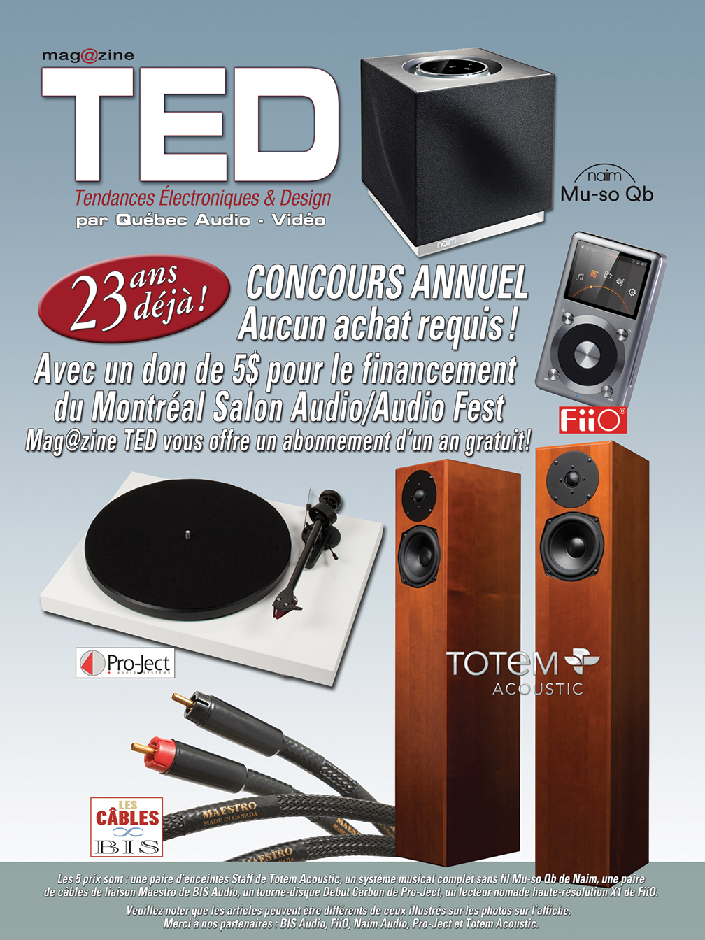L’année 2016 fut mouvementée pour l’exposition audio annuelle de Montréal. Par contre, celle-ci a tout de même eu lieu comme plusieurs d’entre vous le savent déjà. Depuis 23 ans déjà, mag@zine TED y participe avec plaisir et cette année, avec l’aide des visiteurs, nous avons fait une levée de fonds visant la continuation de cette événement et il nous fait plaisir de vous annoncer qu’une somme de 1 505 $ a ainsi été remise aux organisateurs du Montréal Salon Audio / Audio Fest 2016 afin d’aider l’organisation à régler les dépenses encourues et à constituer un fonds pour l’année prochaine. Un grand merci à tous les donateurs pour leur participation et leur générosité.