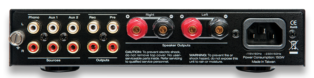Il est tout petit, pour ne pas dire minuscule, mais bien proportionné, élégant dans son coffret noir et de taille basse, d’apparence discrète avec sa face avant en aluminium finement brossé et ses commandes délicates. Mais que peut-il faire contre de véritables géants aux multiples boutons ? Eh bien beaucoup de choses et bien plus que sa taille le laisserait supposer ! Je vous décris le i100 de Mies. Sur le plan des connexions, on y branche une platine (vous savez, les grands disques, les noirs, ceux qui reviennent à la mode tellement le son était bon) un premier appareil auxiliaire (un lecteur de CD, vous savez le petit disque de plastique qui se fera peut-être dissoudre par la lecture dématérialisée), un second appareil auxiliaire (une télé, vous savez l’écran qu’on est en train d’améliorer en multipliant la constante 4K à une vitesse folle), une sortie fixe et une sortie variable, et des borniers pour les enceintes.