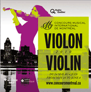 Rappelons que le jury de l’édition 2010 est composé de Patrice Fontanarosa (France), Rodney Friend (Royaume-Uni), Michael Frischenschlager (Autriche), Dong Suk Kang (États-Unis), Paul Kantor (États-Unis), Vladimir Landsman (Canada), et Martin Beaver, (Canada). L’œuvre canadienne imposée sera une composition originale pour violon solo de Kelly-Marie Murphy, dont la musique a été jouée au Royaume-Uni, au Japon, en Europe et en Amérique du Nord par de nombreux ensembles et solistes de renom.