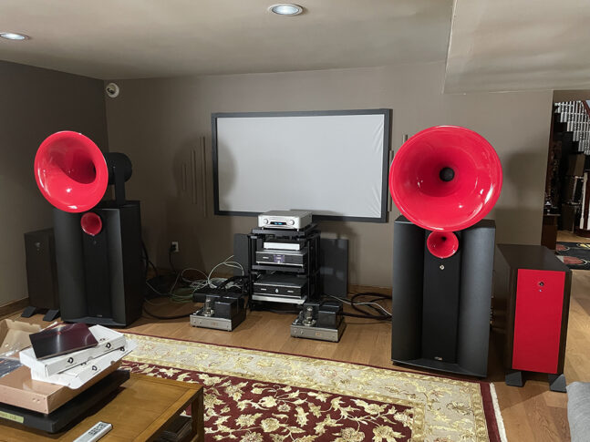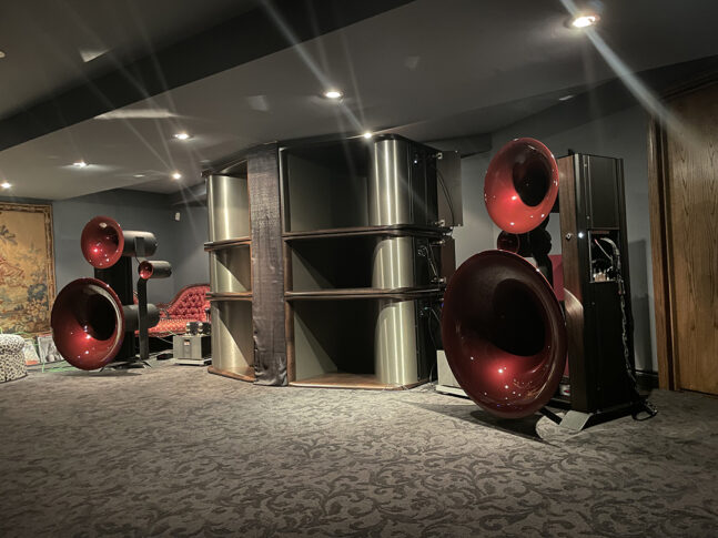 In the large back room was the pièce de resistance of the visit. Audio taken to an extreme high-end level, combining the Avantgarde Trio G3 with six… yeah six Avantgarde Spacehorns; two Single Drive units and four Twin Drive units.