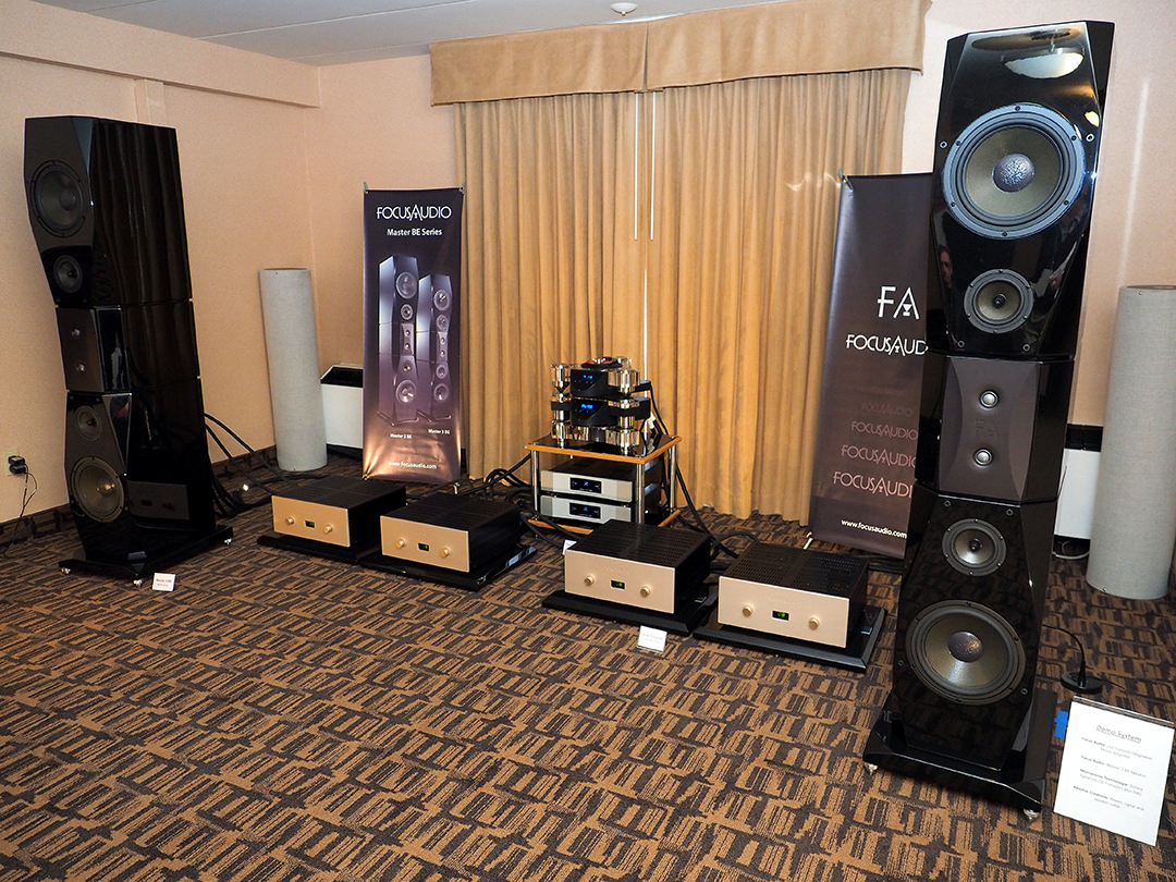 L’espace du fabricant canadien Focus Audio qui comprend sa grandiose enceinte Master 2 alimentée par ses amplificateurs à lampes Litz Concerto.