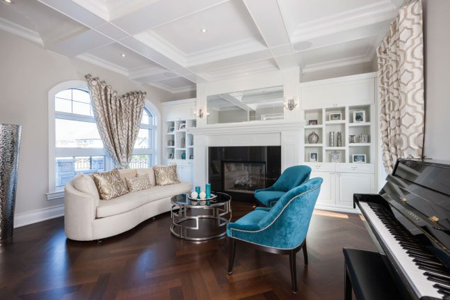 Faisons ensemble le tour de cette remarquable résidence. Remarquez les détails de construction comme les plafonds à caissons et les planchers de marbre ou de parqueterie. L’éclairage intégré complète l’ambiance lumineuse et chaleureuse. La cuisine est rutilante, mais demeure conviviale grâce à l’agencement et au dosage des matériaux utilisé comme le marbre, le chrome, le bois et l’acier. Le salon est sobre et chic avec ses lignes droites, ses petites alcôves, la pierre utilisée pour le manteau du foyer et les sofas et fauteuils invitants aux tons pâles et naturels. Rejoignons ensuite l’admirable salle à manger principale surplombée par la magnifique balustrade en fer forgé du second étage, le tout offrant une vue extraordinaire sur cette magnifique pièce au plafond très haut. Après le repas, on se déplace au boudoir où l’on peut s’installer confortablement et faire la conversation ou bien encore écouter quelques airs joués au piano.