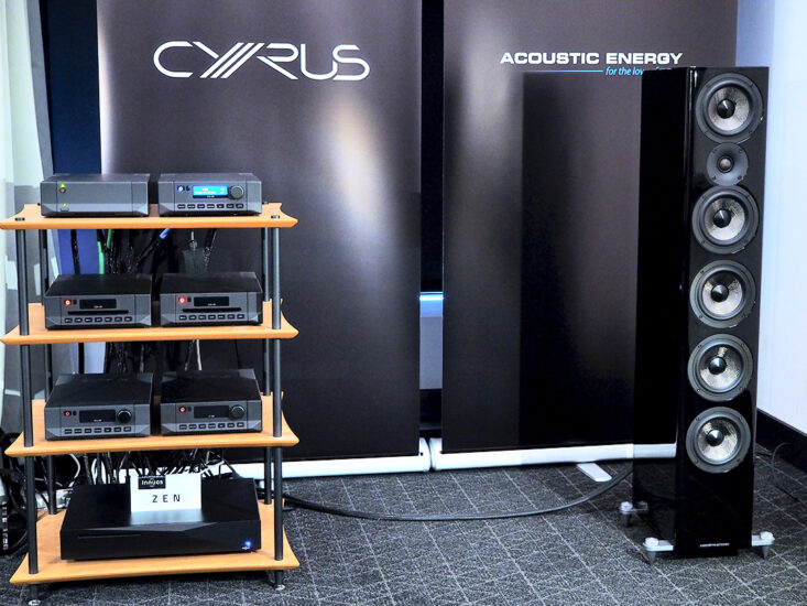 Dans la première, l’on pouvait y apprécier un ensemble Cyrus composé du préamplificateur Cyrus Pre XR, de l’amplificateur Cyrus Stereo 200, du transport CD Cyrus CDT, du lecteur réseau Innuos Zen MK3. Cet ensemble alimentait les enceintes AE520 d’Acoustic Energy. Tous les câbles provenaient du fabricant Black Rhoduim.