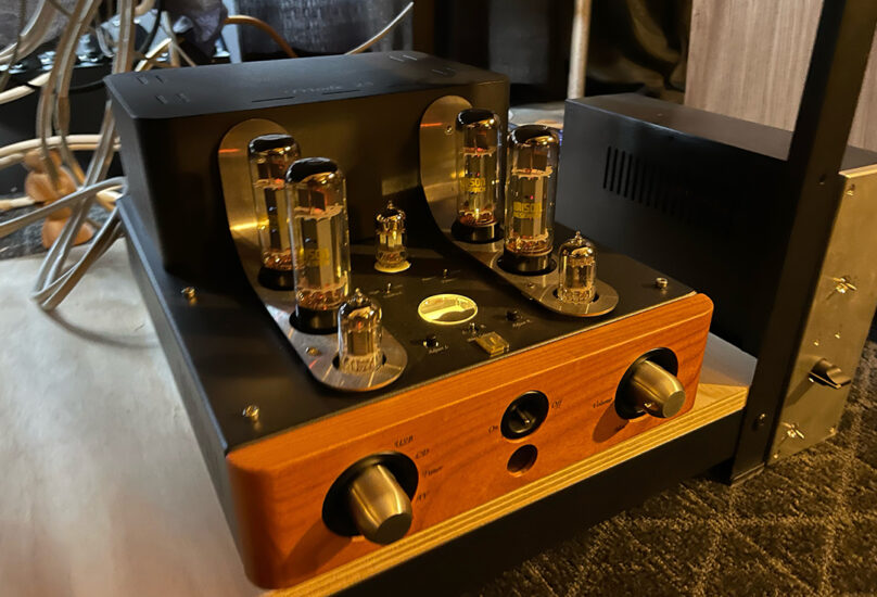 La première chaîne utilisait un amplificateur Triode 25 d’Unison Research. Ce magnifique appareil utilise des tubes EL34 pour son étage de puissance. Celui-ci est configurable en mode pentode pour 45 W/par canal, ou en mode triode avec 25 W pour plus de pureté. Branché sur des enceintes Jazzon de Cube Audio, la sonorité de cette chaîne nous offrait un rendu, direct, vivant, très live avec une cohérence sans faille et une assise dans le grave surprenante.